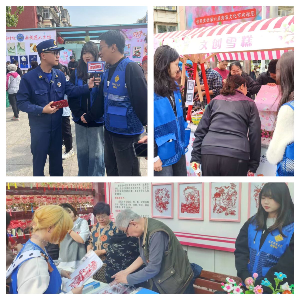 图书馆志愿服务团队充分发挥高校人才的专业优势,在街道负责人指导下,以“一老一小”为主体,通过讲解导览、消防安全宣传及传统文化体验等形式为居民们提供暖心服务。在活动现场,社团学生耐心解答居民咨询,带领居民游览文化节展区,结合现场剪纸、书法、国画展品和传统美食讲述天津地域文化,并参与消防安全宣传互动问答,向居民普及家庭防火知识。同学们以严谨的工作态度和饱满的服务热情,赢得了活动主办方和现场居民的一致好评。